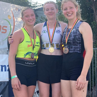 Onze sterke juniorendelegatie pakt 6 nationale titels vandaag! Ides (speer 64.46-discus 53.44), Emma (speer 41.66) en Charlotte (5000-16.53.48) ontgoochelen niet als lijstaanvoerders en houden de concurrentie op ruime afstand. Cédric (100m 10.66-200m 21.46) klopt eerst knap nipt de favoriet op de kortste afstand, en maakt het af op de 200m! Voor eerstejaars Zowie een dubbele opsteker met een dik PR van 39.24 en het zilver na Emma! Net zo voor Steffi (100h 14 .61-100m 12.88) die als vierde op de ranglijst twee topfavorieten in de hordenfinale naar huis loopt. Geen hoog maar wel verspringen voor Merel met 5m71 en brons als resultaat. Pechvogel Stijn (100m 10.96-200m 21.95 PR) komt één honderdste tekort voor het 200m podium maar duikt wel voor het eerst onder de 22" grens. Lorien eindigt over 100m in 13.59 en finisht op 200m na 28.27. Slechts 2 beloften kwalificeren zich voor dit BK en niet van de minste. Anouchka (100m 11.98 -200m 24.83) zet de kroon op haar mooie seizoen met twee bronzen medailles. Lotte zet aan op de baanronde en haalt 64.49.